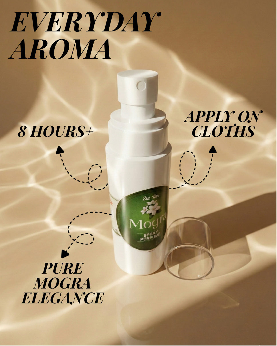 • Mogra is a timeless floral fragrance inspired by the delicate and enchanting aroma of fresh jasmine blossoms. Its sweet, creamy, and uplifting scent creates a feeling of freshness and elegance, filling the air with a soft floral charm. The fragrance leaves a graceful and soothing trail that feels both romantic and refreshing